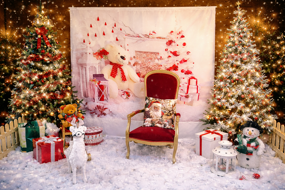 Rideau blanc de Noël avec cheminée, ours, sapin Longueur : 3,50 m - Hauteur : 2,10 m - Largeur : 1 m Un beau décor pour de belles photos.